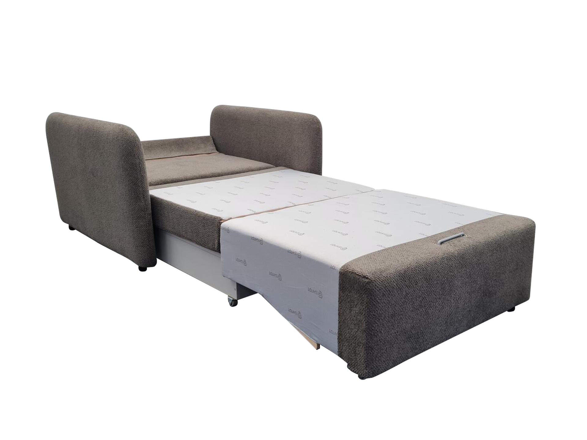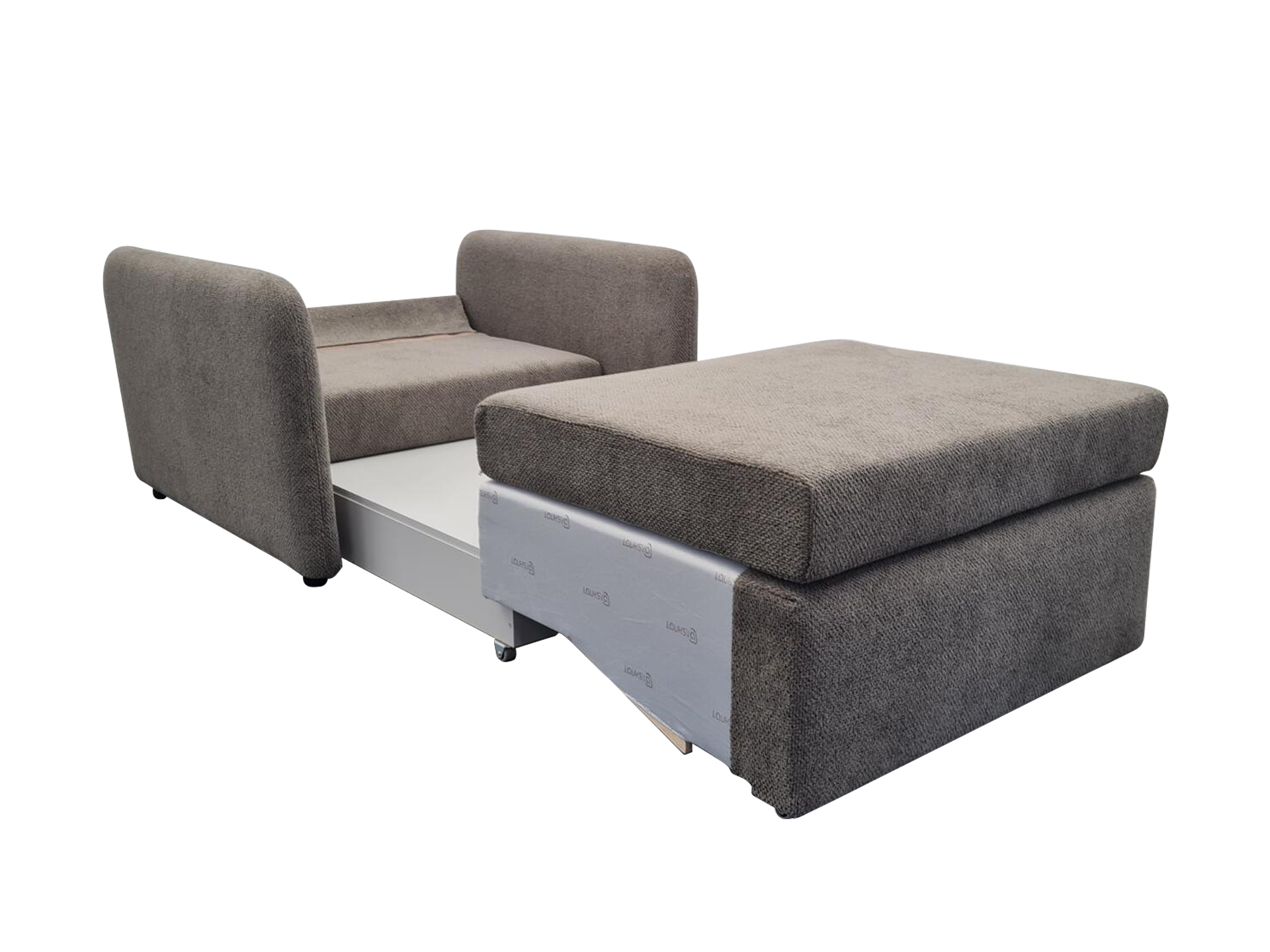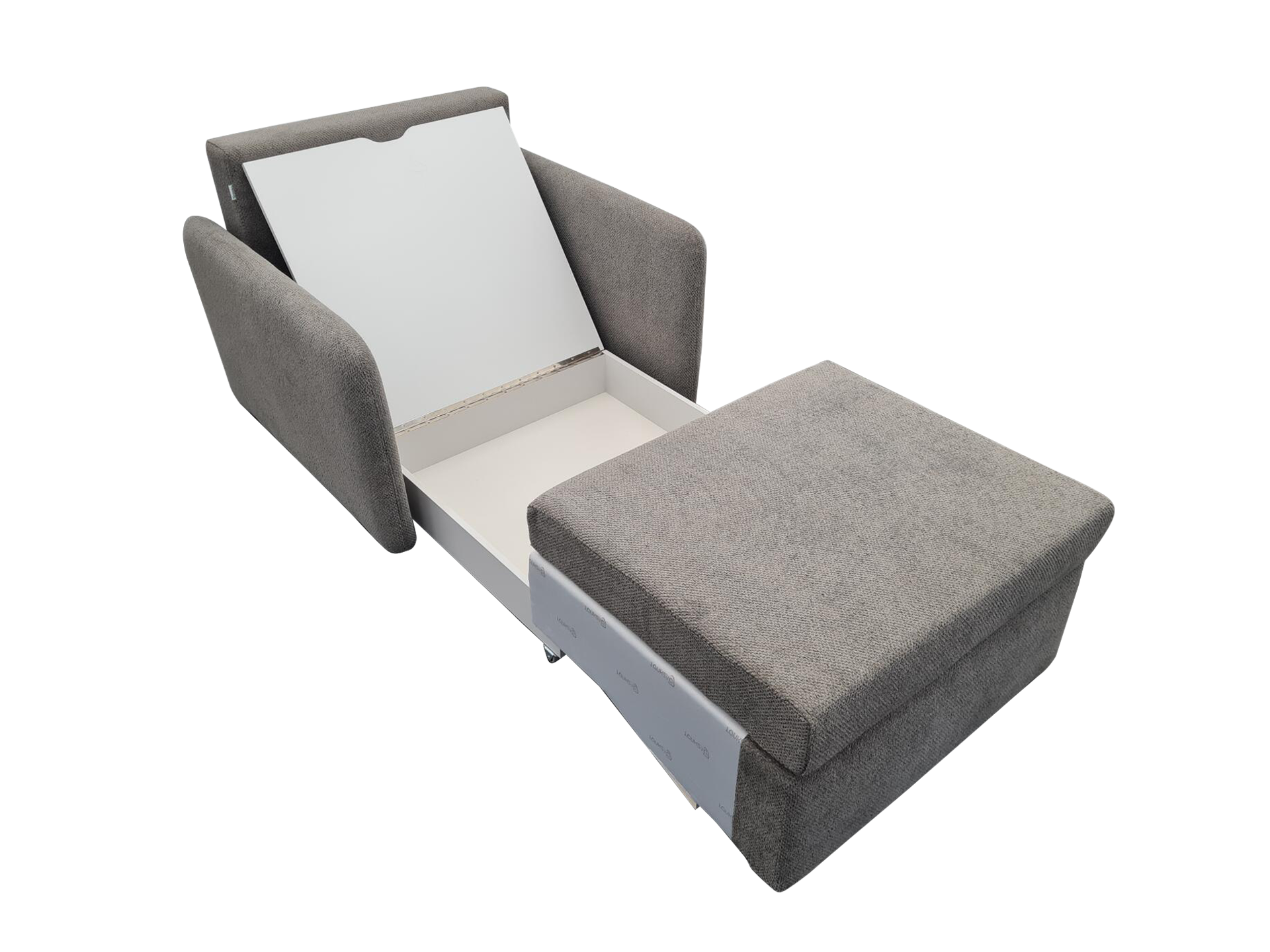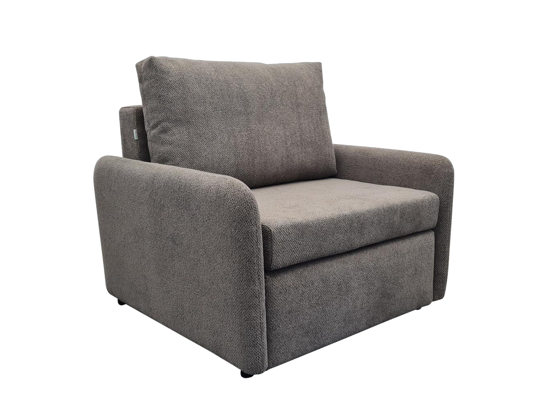 TOTO dizaino viensėdis fotelis su išskleidžiamu miegamu mechanizmu, patalynės dėže ir minkštais apvalintais 10 cm pločio porankiais.